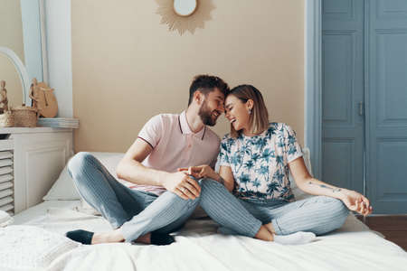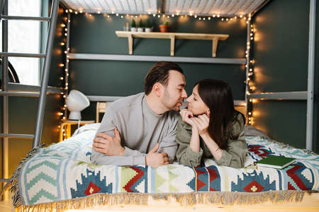 Lovely couple have fun, rest and relax on the bed in the bedroom. Lifestyle concept