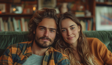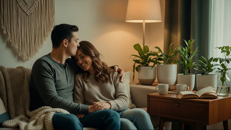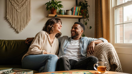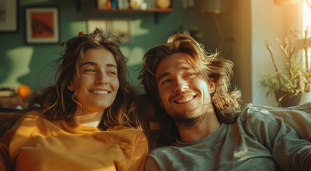 A smiling couple sits together on a sofa, sharing a joyful moment indoors. The scene features warm natural lighting and a cozy atmosphere. The composition includes a window, decorative elements, and plants suggesting a comfortable home environment. This image could be used for various commercial and editorial applications.
