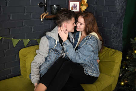 young couple in love sitting hugging on the couch
