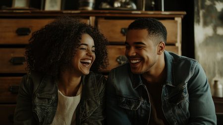 Couple enjoying a joyful moment together while laughing in a cozy room filled with vintage decor