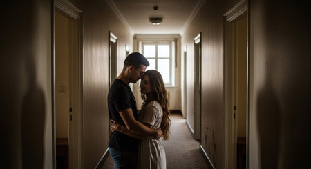 Couple sharing an intimate moment in a softly lit hotel corridor.