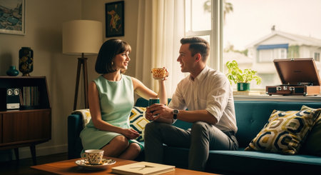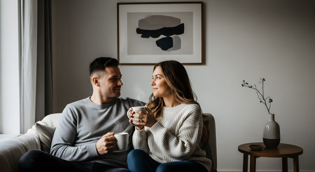 A happy couple sits on a sofa in a minimalist living room, holding white mugs and looking affectionately at each other. The scene captures a relaxed morning moment of connection and romance at home.