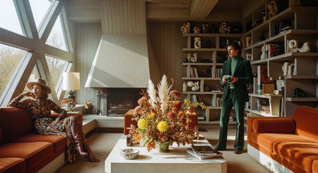 A stylish couple standing in a modern interior, the woman in a floral skirt and blazer, the man in a patterned suit holding a camera, both looking at each other