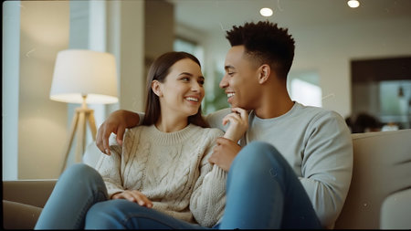 Young multiethnic couple sitting on sofa in living room at home