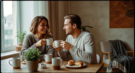 A smiling couple sits at a table, holding coffee mugs and surrounded by pastries, plants, and a warm atmosphere in a modern living room with a large window.