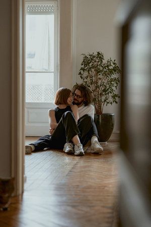 Smiling couple hugging and enjoying time together while sitting floor at home. Good relationship time