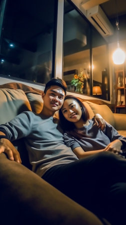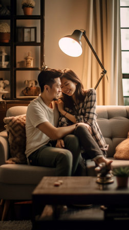 asian couple in love in modern living room at home