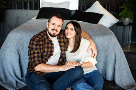 Love story at home. A guy in a casual shirt and a girl in a knitted sweater are sitting near a huge bed in a Scandinavian style bedroom.