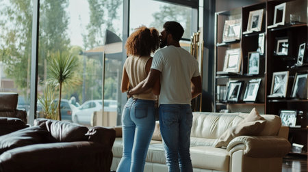 A couple browsing new furniture in a showroom, planning their new living room setup
