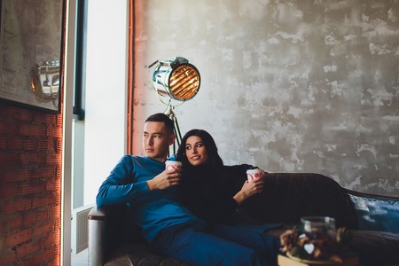 Romantic couple sitting on couch and sharing cup of coffee