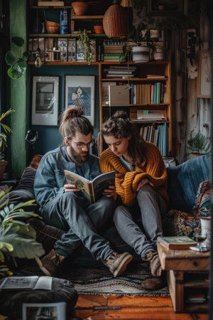 A man and a woman are sitting on a couch reading a book together. The room is decorated with plants and has a cozy atmosphere