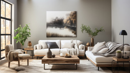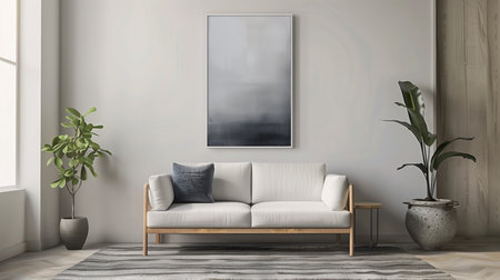 Concept illustration of a modern living room with a picture frame on the wall. Generative AI