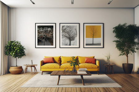 Modern living room interior with a yellow sofa, a coffee table and three posters on the wall. 3d rendering mock up
