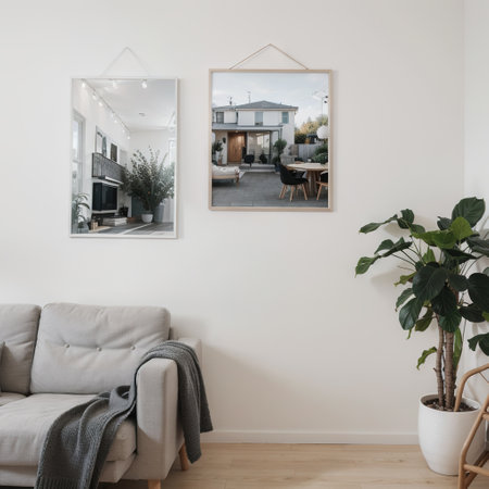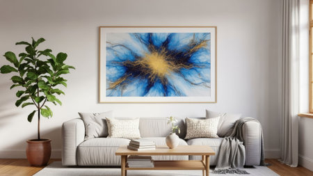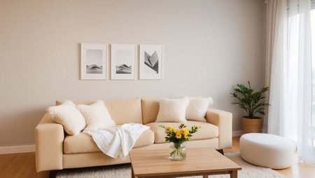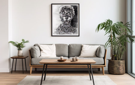 Concept illustration of a modern living room with a picture frame on the wall. Generative AI