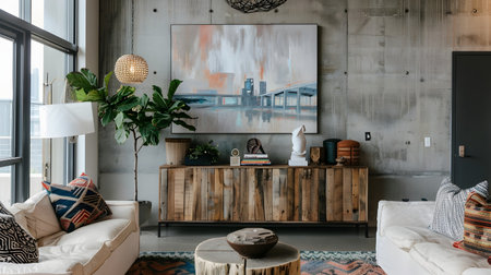 Living room decor, home interior design . Modern Industrial style with Large Wall Art decorated with Concrete and Steel material . Generative AI AIG26.