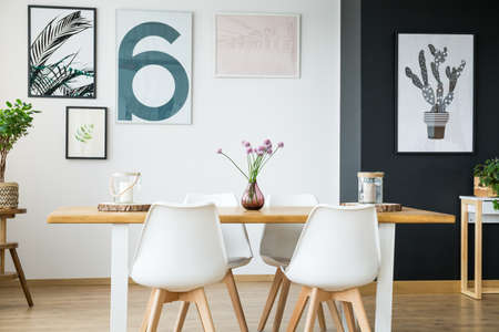 Black and white wall with posters in spacious dining room