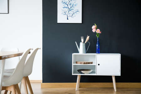 White cupboard with decoration in scandi style dining room