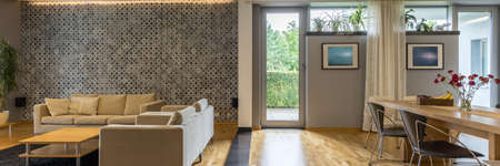 Panorama of contemporary room with big decorative mirror