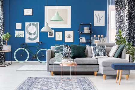 Different kind of pillows on comfortable grey corner sofa in elegant living room with blue wall with posters