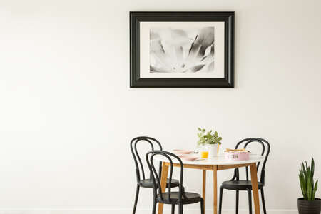 Real photo of a laid dining table with black chairs and painting on an empty wall. Place your graphic