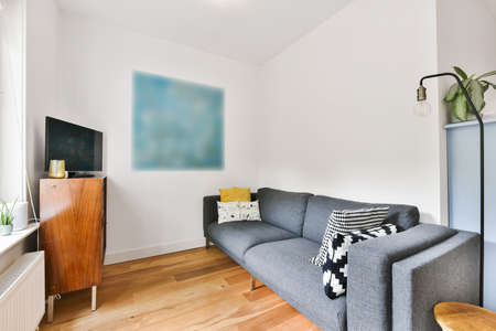 Comfortable sofa with cushions placed against light wall with TV and decorations in modern loving room