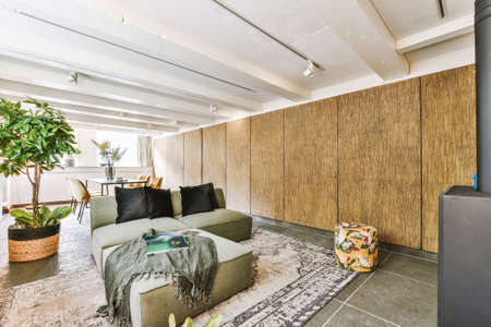 Spacious up-to-date designed lounge with wicker carpet and wooden coffee table