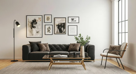 Contemporary living room showcases a black sofa adorned with cushions, a chic coffee table, and artistic wall decor, enhancing the warm and inviting ambiance, AI generated