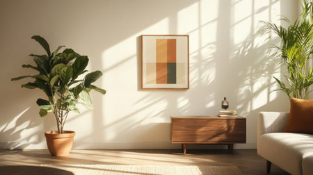 A bright and airy living room featuring a framed artwork, wooden cabinet, and lush plants, bathed in natural sunlight.
