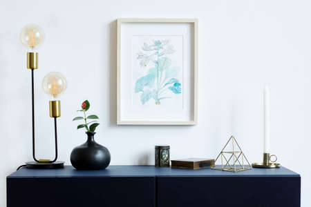 Interior floral poster mock up with vertical wooden frame, table lamp, , accessories, candle , gold pyramid and flowers in black vase on the white wall background. Concept with navy blue shelf.