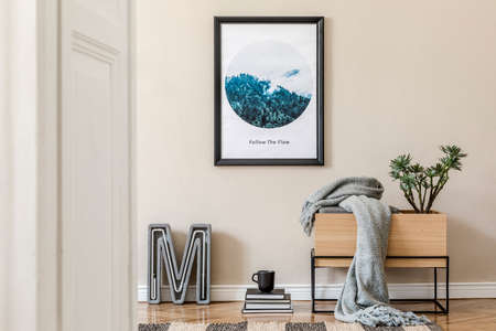 Design scandinavian home interior of living room with mock up poster map, stylish wooden bench, retro chair, rattan basket, flower and elegant accessories. Beige wall. Stylish home staging. Template.