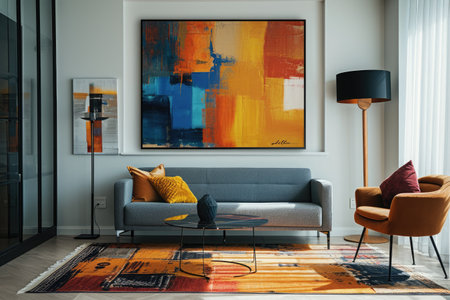 The interior of the modern living room is with sofa, coffee table and colorful wall painting.
