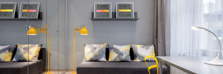 Panorama of stylish room with gray wall and couch, simple desk with yellow chair and wardrobe with mirrored doors