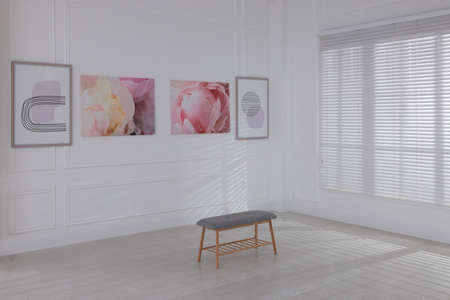 Bench and beautiful paintings in art gallery