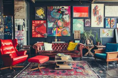 A luxurious interior featuring bold art pieces, elegant furniture, and dramatic lighting, creating a refined and cozy atmosphere.