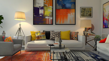 Modern living room with abstract paintings and geometric cushions, showcasing a trendy interior design.