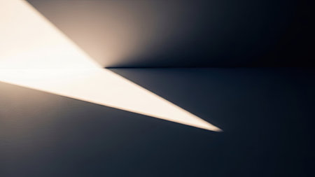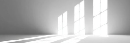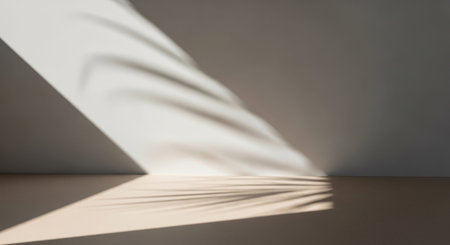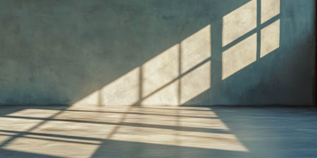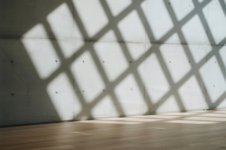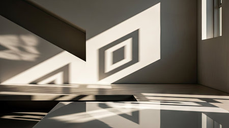 A serene and minimalist interior space featuring soft sunlight casting intricate geometric shadows on the wall and floor, creating a tranquil ambiance.