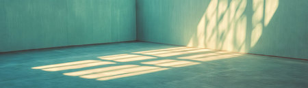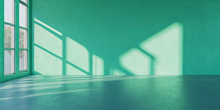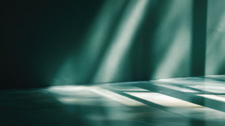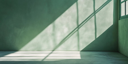 Sunlight streaming through window casting long angular shadows on textured green wall and smooth floor in empty minimalist interior space.