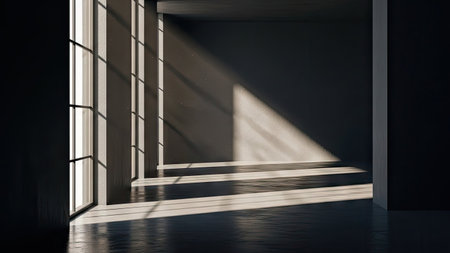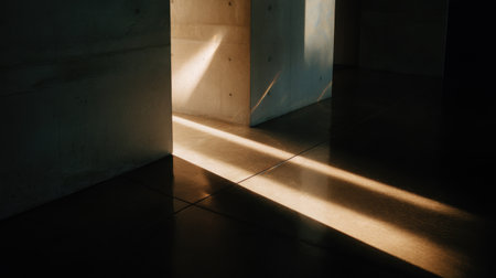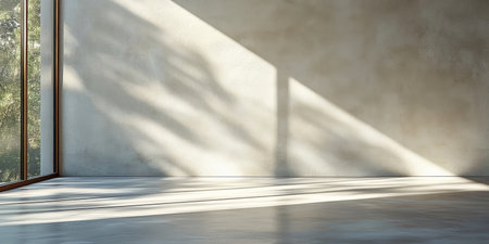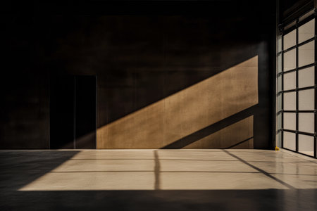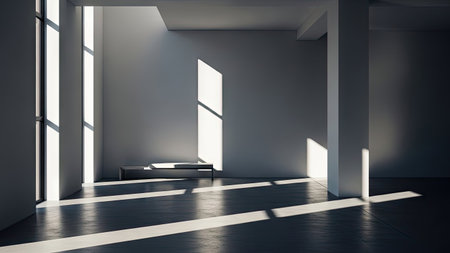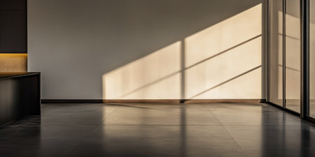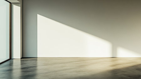 An empty interior space is bathed in sunlight streaming through a large window. The image showcases the interplay of light and shadow, highlighting the architectural lines and textures of the room. The composition suggests a modern, minimalist design. Suitable for commercial and editorial uses.