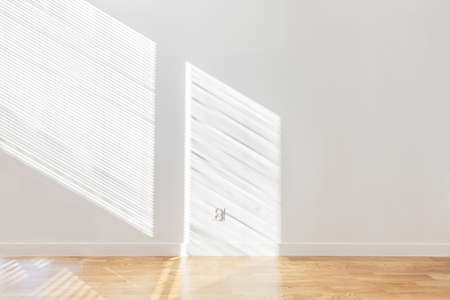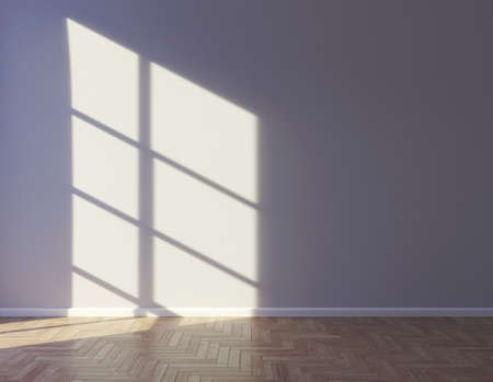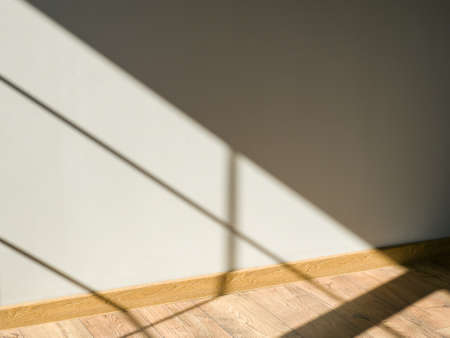 Interior of modern empty room with wooden floor, sunlight and shadows