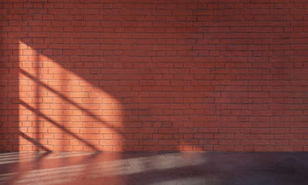 3d rendering illustration of big modern room with red brick wall, polished concrete floor. Interior with bright sunlight. Studio, showroom, photostudio, stage. Light from window.