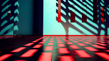 Room with checkered floor and red light coming from the ceiling. Generative AI.