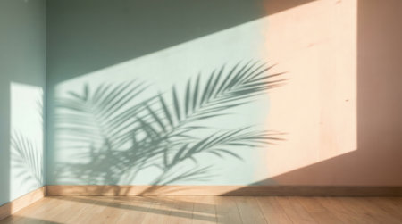 Abstract background of a sunlit room with a shadow of a tropical palm plant on the wall. Minimalist interior with warm light creating a serene and peaceful atmosphere.