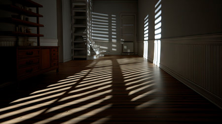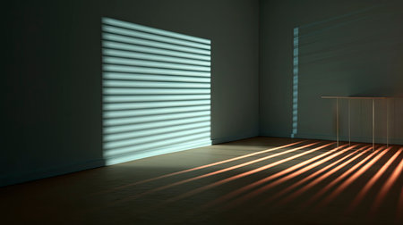 An interior shot features a large window casting strong sunlight and shadows across the room. The composition highlights the contrast between light and dark within the space, emphasizing linear elements. This image is suitable for use in design, architectural, or conceptual projects.