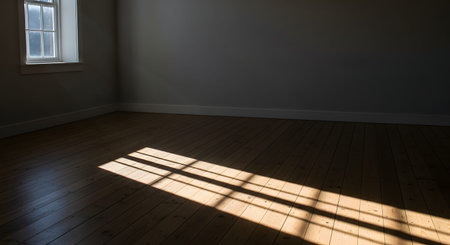 An empty room with polished wooden floorboards and white walls. Sunlight streams through a window, casting a distinct grid-like shadow on the floor, creating a sense of space and potential.