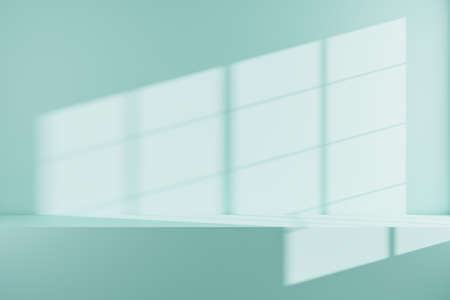 Minimalistic simple abstract light blue background for product presentation. Shadow and light from windows on wall