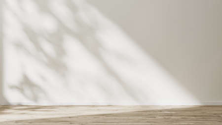 empty room mock up with wooden floor and empty white wall with sunlight and leaves shadow, 3d rendering