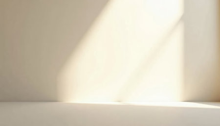Beige wall and large window. Sunlight is streaming through window, casting long shadows on wall. Room is bright and airy, with clean, minimalist feel. Background for interior or product display.