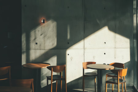 A brutalist inspired coffee shop, with minimalist furniture, rough concrete walls, and soft industrial lighting casting deep shadows.