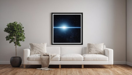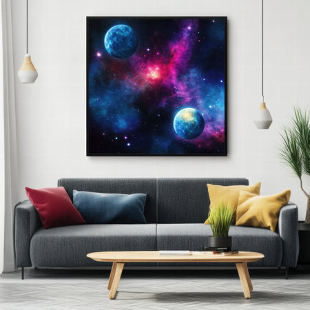 Colorful galaxy artwork featuring brilliant stars and glowing planets enhances the contemporary living room decor with cosmic beauty.