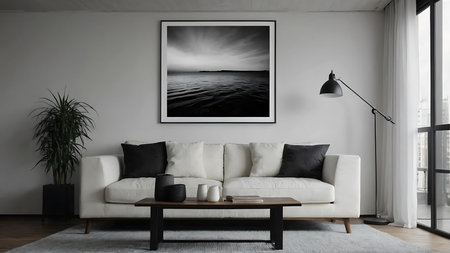 Modern living room interior with black sofa, coffee table and picture frame